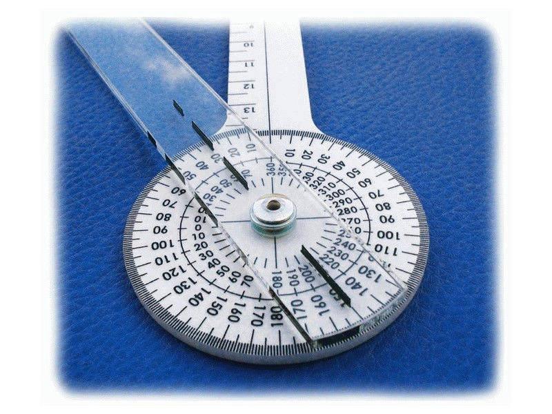 Goniometr o długości 20cm (po rozłożeniu 34cm). Średnica głowicy przyrządu wynosi 6cm natomiast jego szerokość 1cm. Goniometr posiada obrotową głowicę oraz dwie skale kątowe z podziałką 1st. Konstrukcja goniometru zapewnia wysoką trwałość oraz długi czas użytkowania. Przyrząd wykonany został z plastyku PMMA.